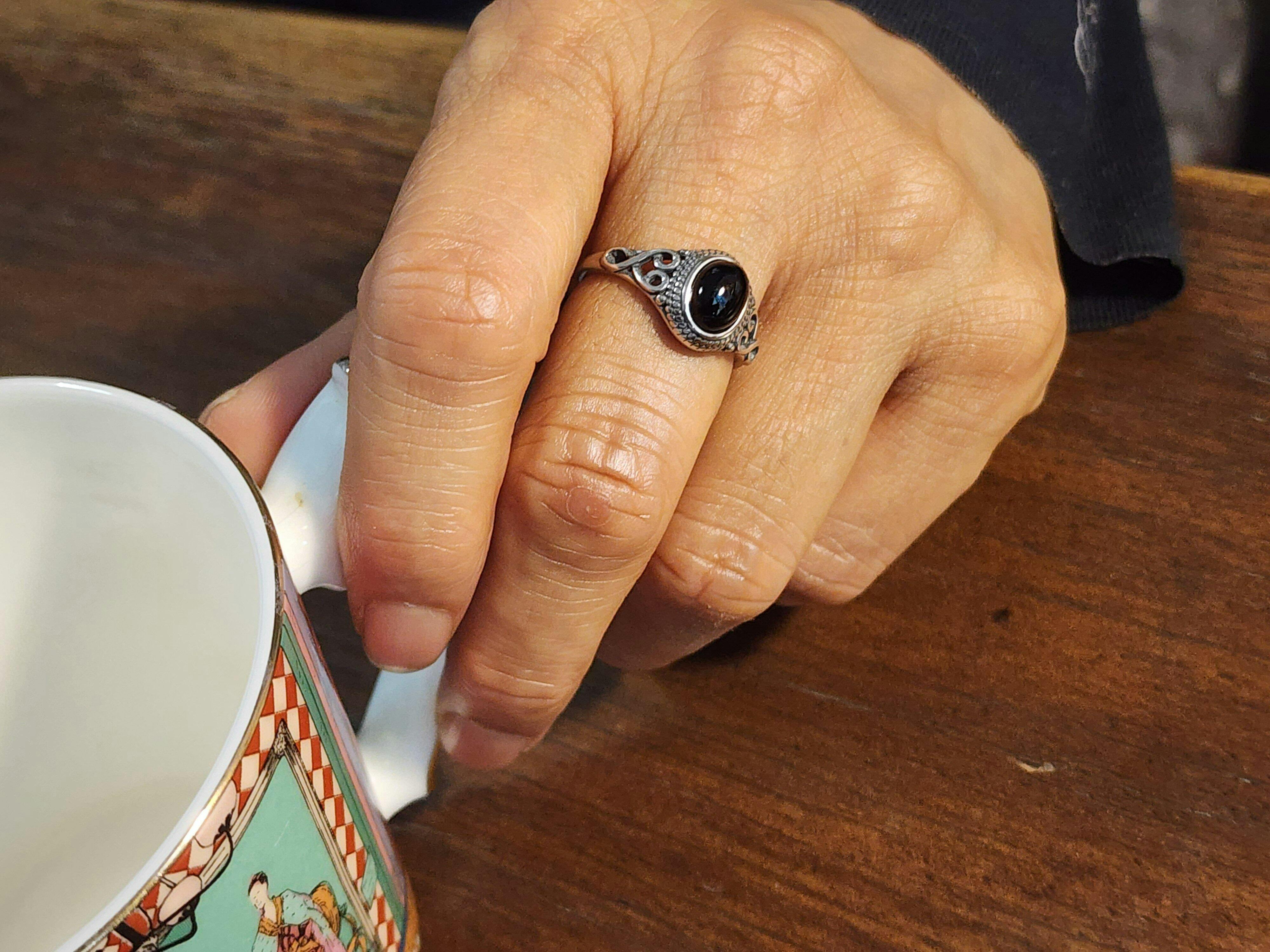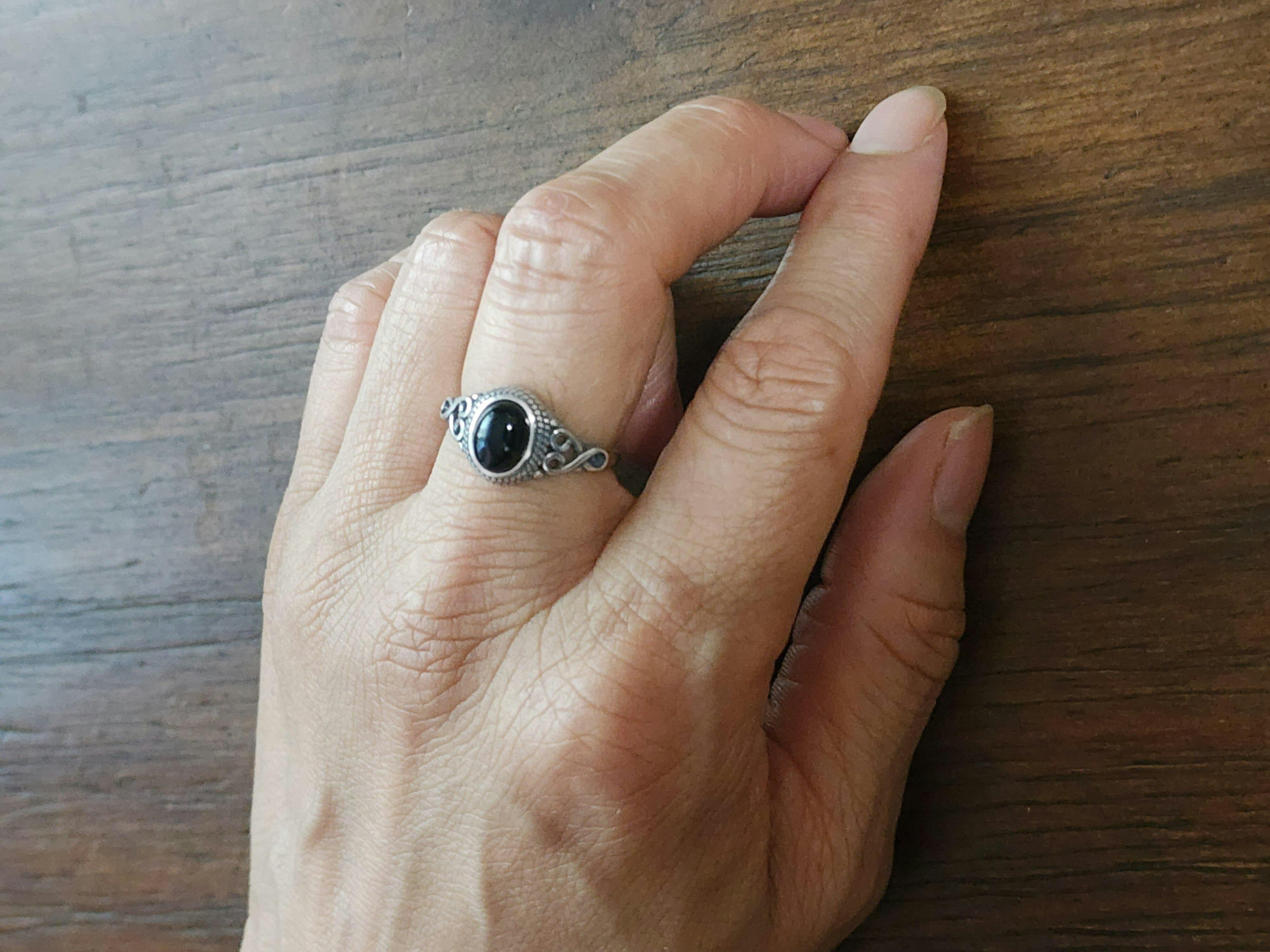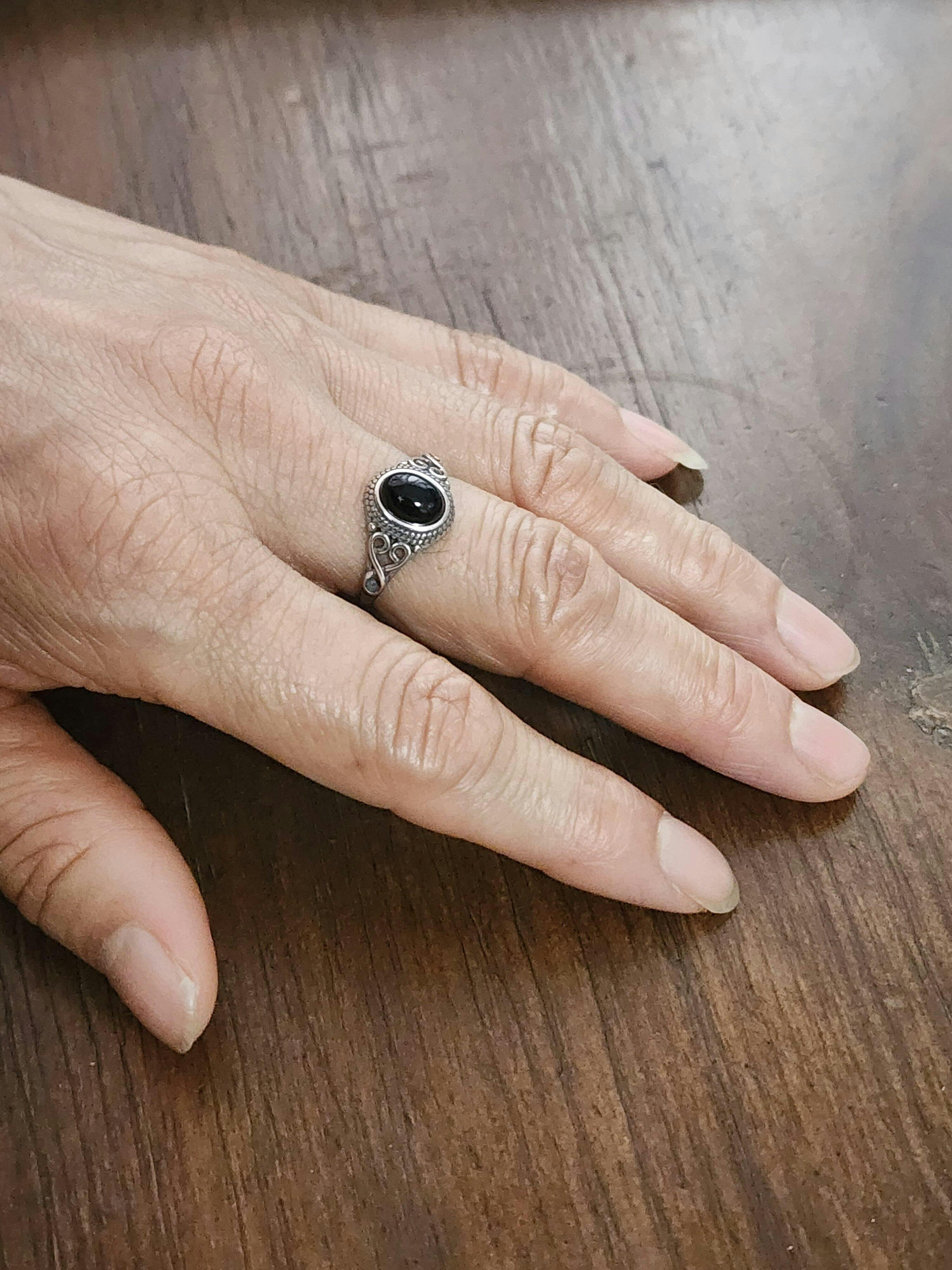 - Crafted from 925 silver, this ring centers a smooth, oval black onyx—its deep shine framed by vintage-inspired openwork for timeless elegance.